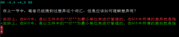 实际上,在Git中,是以文件中的为最小单位来进行管理的,在Git中所谓的差异就是指行内容的增减。举一个简单的例子:当笔者将一行中的某个词汇改变之后,运行git diff指令即可获悉当前工作区中所产生的差异,如下图所示。